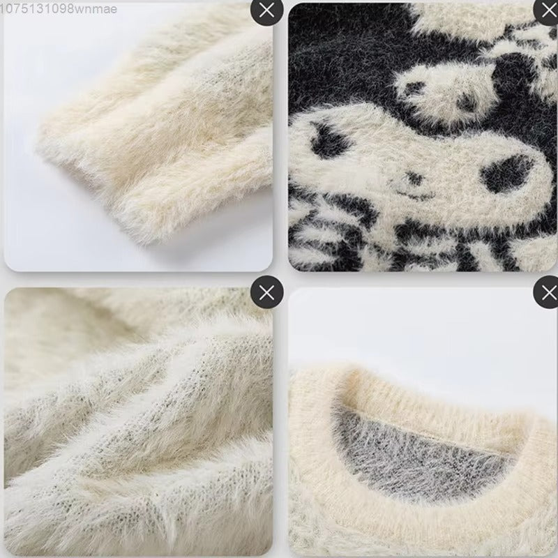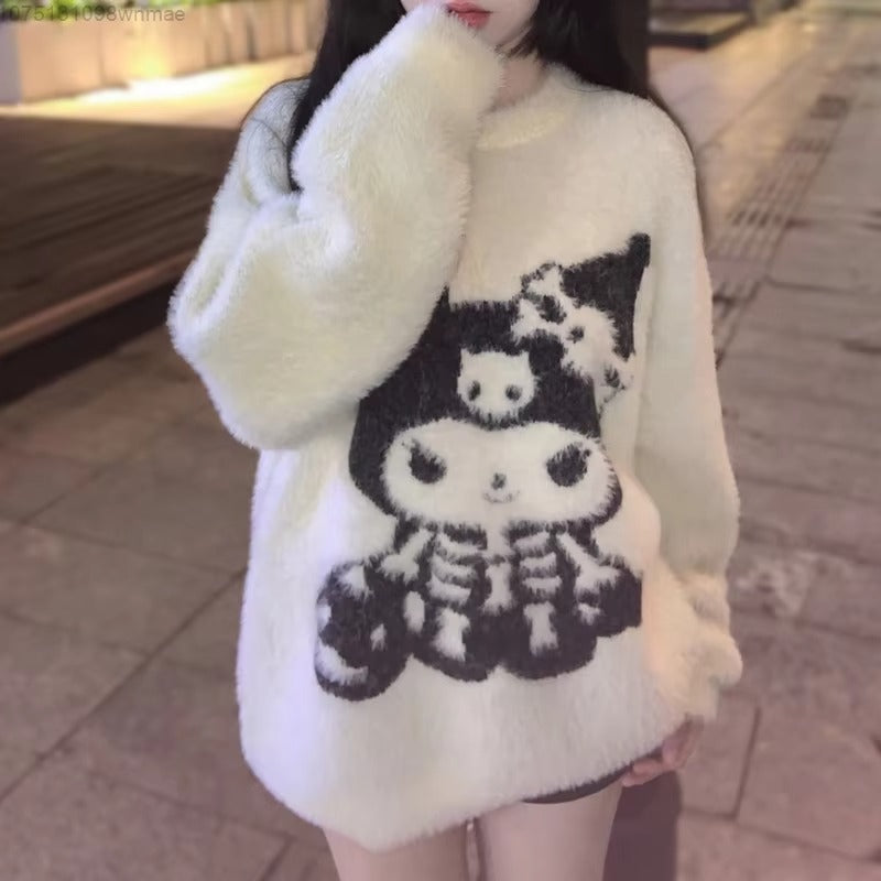 Featuring an oversized Kuromi graphic in bold contrast stitching, this sweater brings your favorite mischievous character to life with plush texture and eye-catching detail. The fluffy knit material gives a dreamy, cloud-soft feel against the skin, while the relaxed fit and ribbed cuffs keep you snug and stylish.