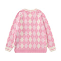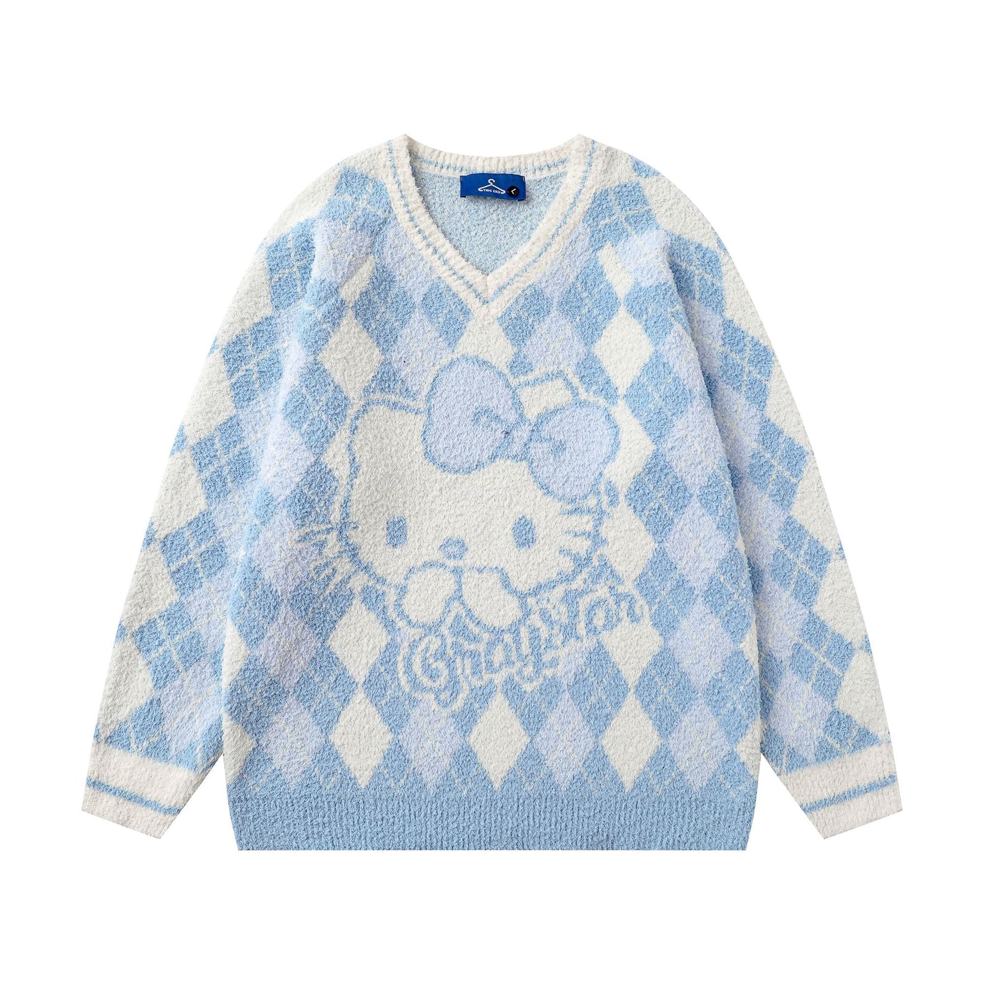 Featuring a soft pastel argyle pattern in baby pink or sky blue, this sweater is detailed with an adorable Hello Kitty motif front and center. The subtle textured knit adds dimension, while the relaxed fit and V-neckline give it a comfy, laid-back vibe perfect for layering or wearing on its own.